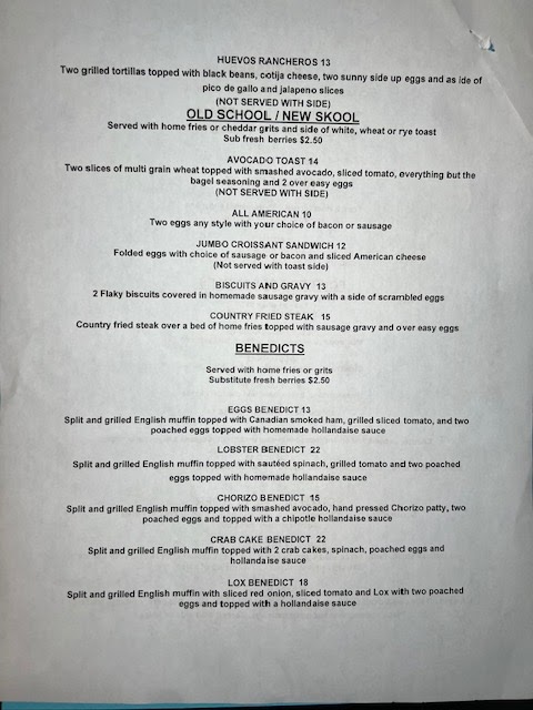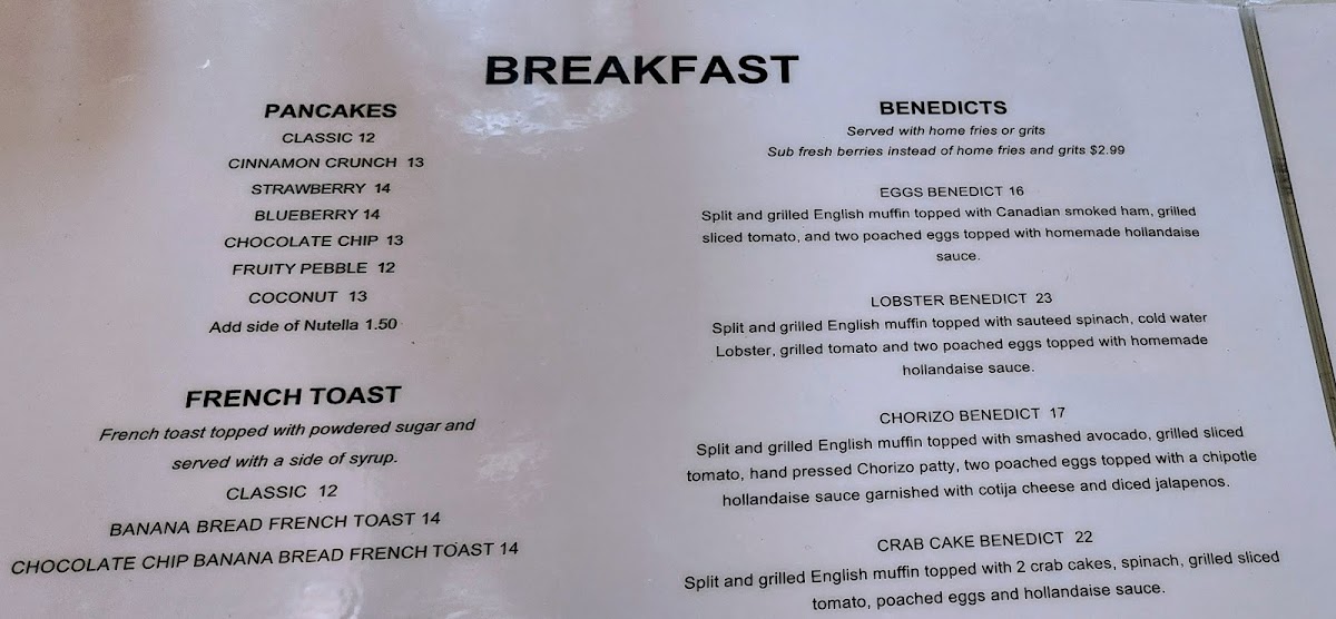 Split and grilled gourmet English muffin topped with sautéed spinach, sliced tomato Maine lobster, poached eggs and hollandaise sauce. Served with home fries or cheddar grits