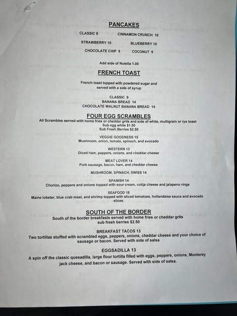 Two tortillas stuffed with scrambled eggs, peppers, onions, Cheddar cheese and your choice of sausage or bacon. Served with salsa and home fries or cheddar grits